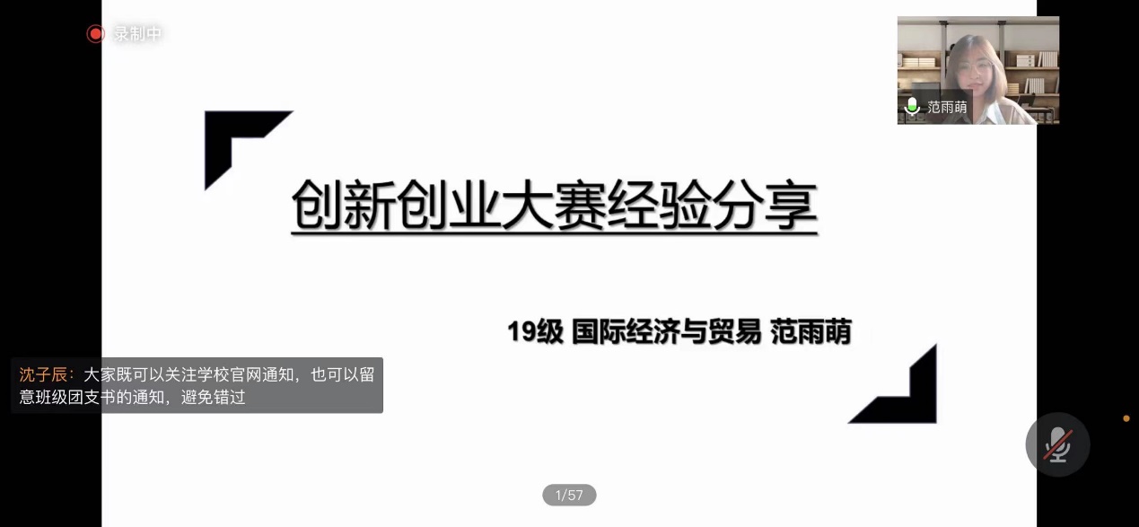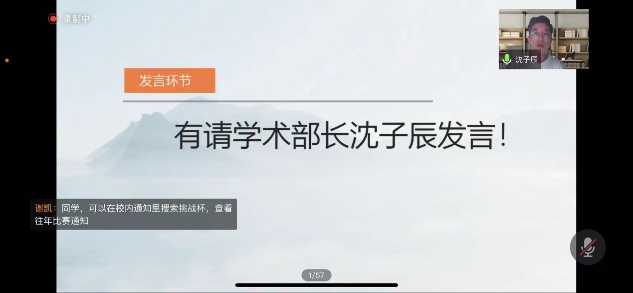 会议开始,校团委副书记谢凯老师为全体参会同学做了有关“挑战杯”创新创业竞赛、《“三大赛”竞赛管理办法》专题的报告。谢老师从竞赛简介、作品申报、备赛过程、文件解读等七个方面全面细致地向同学们介绍了“三大赛”的流程。谢老师对各项赛事详尽清晰的介绍,点燃了初次接触科研赛事的21级小萌新们点燃了小21们思想的火花。于是,在谢老师的报告之后,同学们纷纷在评论区打出了自己的疑问,谢老师也耐心地逐条回复了这些问题。