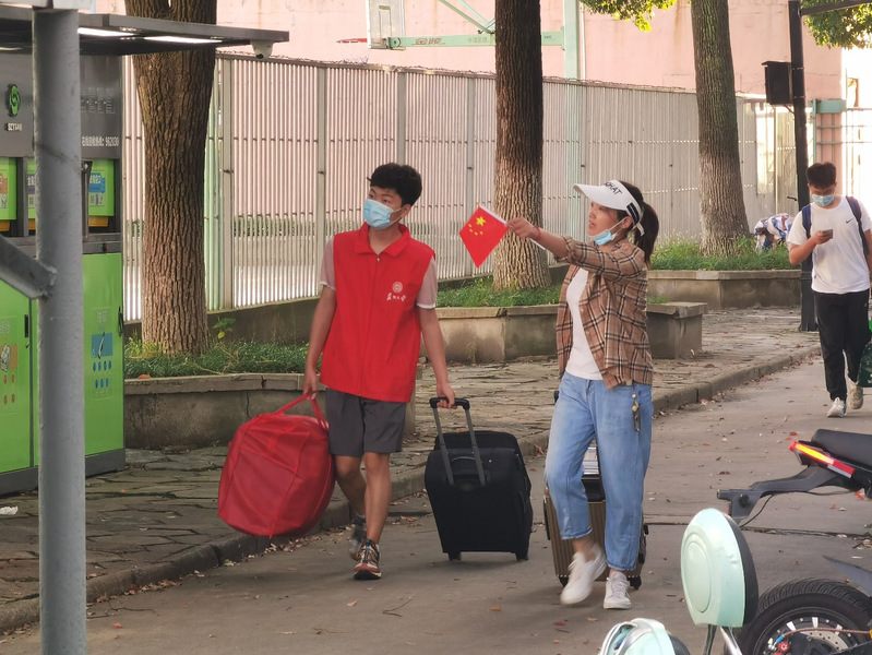 宿舍楼前是迎新另一道别样的风景线。志愿者们热情引导小21们登记、测体温、领钥匙;耐心回答小21们的问题,安抚担心的家长们;主动帮忙卸下行李、照看行李、搬运行李。宿舍门前是他们的阵营,楼道间是他们的身影,汗水里是他们的真心。“谢谢啊,一直忙上忙下的,一头汗呦。”新生家长心疼地说。行人来来往往,他们始终站在最显眼的地方。“需要帮忙吗?”这是他们一天里说的最多的话,却往往等不及回答,就小跑迎上去抢着干活了。实行轮班制的他们,在下一班没有到来前,就绝不会离开岗位,以此保证在新生需要帮助的地方,他们一直都在。
