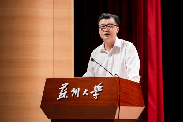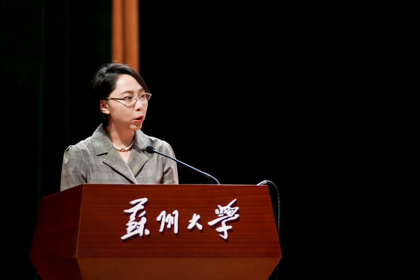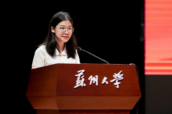 2024级本科生新生代表、工商管理+纳米材料与技术专业宋天逸同学,以生动的语言描绘了新生们初入苏大时的喜悦。她回望了来时挑灯夜战的日子,又展望了风云变幻的未来。宋天逸同学以今天的开学典礼作为序章,殷切期望大家能够用华彩点染人生之书的每一页,书写属于自己的精彩篇章。