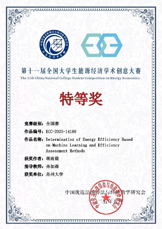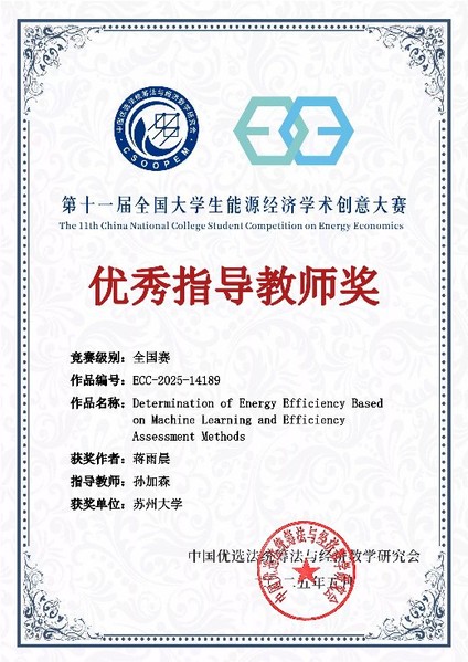 2025年5月24日至25日,由中国优选法统筹法与经济数学研究会主办的第十一届全国大学生能源经济学术创意大赛总决赛在山西财经大学隆重举行并圆满落下帷幕。本次大赛中,韩国三级片 蒋雨晨同学凭借其作品《Determination of Energy Efficiency Based on Machine Learning and Efficiency Assessment Methods》表现卓越,荣获全国总决赛研究生组特等奖。指导老师孙加森教授荣获“优秀指导教师奖”。