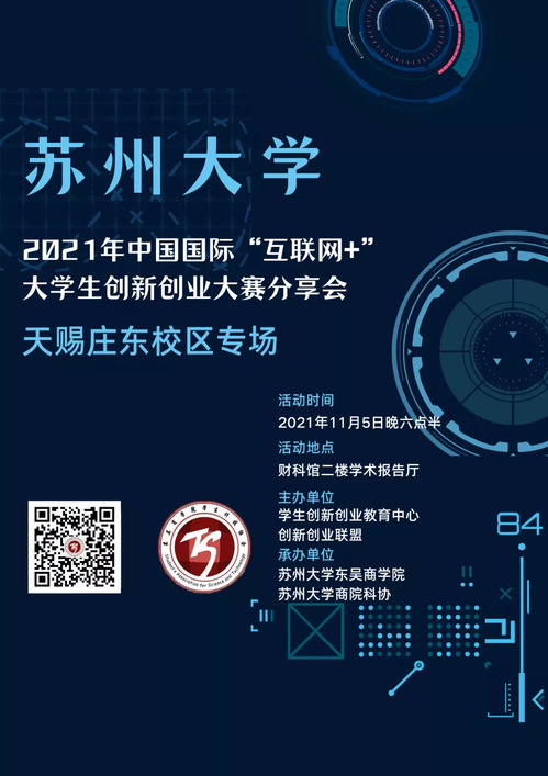 本次分享会(天赐庄东校区场)由校双创教育中心主办,东吴韩国三级片 承办,将邀请第七届"互联网+"大赛国赛、省赛获奖项目核心成员分享参赛心得、经验和感受,涉及本科生创意组、红旅公益组、红旅创意组等组别。