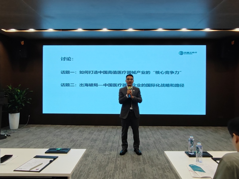 在企业会议室,科塞尔CFO陆总向学员们分享了企业的产品创新与市场布局,揭秘科塞尔引领医疗创新风潮之路。创始人兼CEO胡清先生为学员们分享企业创办的“初心”以及走出去与强者竞争的“雄心”,并发布两大议题:“话题一:如何打造中国高值医疗器械产业的“核心竞争力”“话题二:出海破局--中国医疗器械企业的国际化战略和路径”。学员们围绕这两个议题分小组展开热烈探讨,并由小组代表随后汇报讨论结果。胡总对学员们的发言进行了极大肯定,鼓励学员们要敢于突破。带队老师王魏莎教授对科塞尔的热情接待再次表达感谢,高度评价了科塞尔的企业家精神,表示企业家和教育者本质一样,都需要为社会作出应有的贡献。