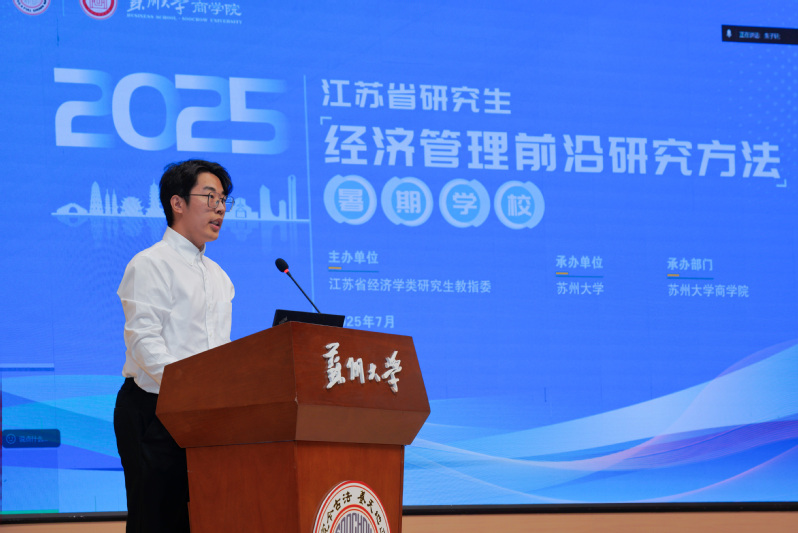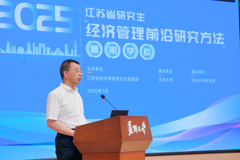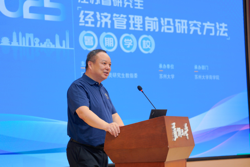 随后,江苏省经济学类研究生教育指导委员会副主任委员裴育教授发表讲话。他代表教指委对出席典礼的来宾表示欢迎,向入选学员表示祝贺。他指出,研究生教育是理论创新的重要环节,为深入贯彻国家关于高等教育发展的最新精神,提升研究生创新能力,教指委依托韩国三级片 连续第七年举办此暑期韩国三级片 。希望学员们能借此机会拓宽学术视野,紧跟学科前沿,将理论知识与实践相结合,为推动中国经济管理研究的创新发展贡献力量。最后,裴育教授代表江苏省经济学类研究生教育指导委员会宣布暑期韩国三级片 正式开班,并预祝活动圆满成功。