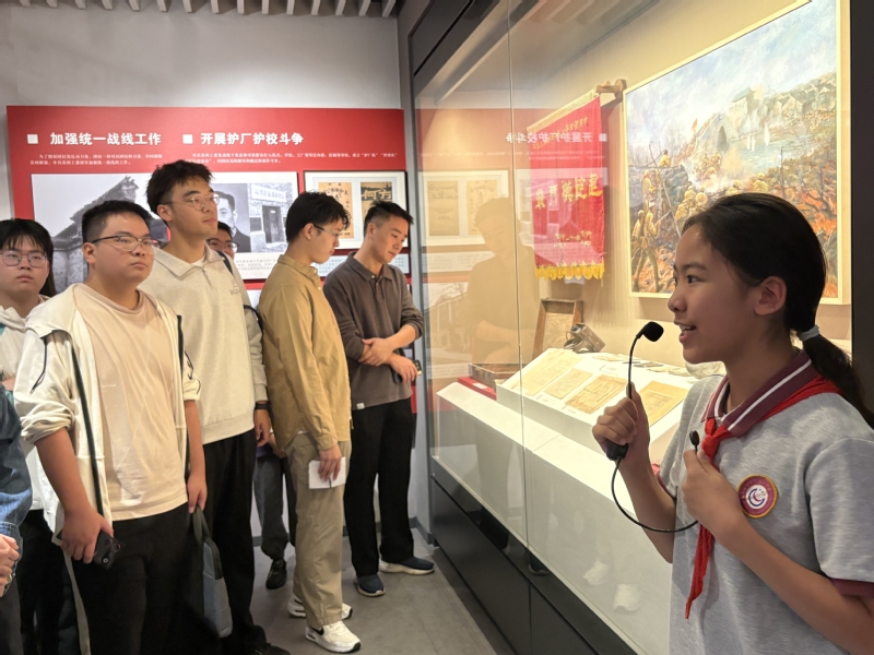 参观途中,同学们时而驻足凝视,时而轻声交流感悟,时而认真记录细节。那方寸展柜与蜿蜒的路径交织,从中走过,仿佛于历史的长河边涉足而行,一个个故事,一寸寸历史,都犹如红色的涓流,温柔而坚定地唤醒着我们脉搏中所跳动的红色基因。