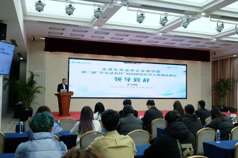 接着,同学们在会议室参加了第二届“东吴证券杯”校园模拟投资大赛的颁奖典礼。东吴证券东吴秀财事业部总经理吴剑峰在致辞中吴剑峰表达了对到访师生的欢迎、对活动参与师生的感谢以及对获奖者的祝贺,并欢迎大家持续关注更多形式的产学合作,提升金融素养,打造财商平台,让更多的青年学子在这里收获知识、收获成长、收获梦想。