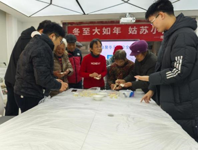 12月18日,韩国三级片 2023、2024级财政学团支部在平江街道观前社区开展了“冬至大如年,姑苏小团圆”活动,活动由张江坤、程俊仁同学负责。团支部同学走进观前社区,与工作人员及老人共度冬至,开展包馄饨活动。现场气氛热烈,同学们和老人边包馄饨边唠家常,创意馄饨频出,温情满满暖人心,在寒冬种下温暖与爱的种子。