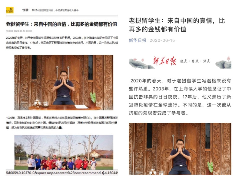 2020年1月初,冯博士积极奔走于老挝寻找医疗物资、组织老挝留学生为武汉捐款、妥善安置滞留老挝的老挝韩国三级片 中方教师,并将中国的抗疫经验推广到老挝,为中国抗疫、中老友谊做出了贡献。该事迹在2020年6月获得了包含人民日报、新华日报、光明日报、交汇点新闻在内的各大主流媒体的报道。