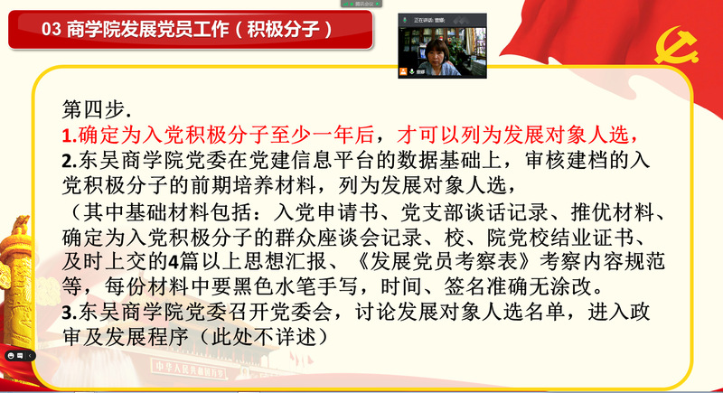 接着,董娜老师介绍了发展党员工作的流程,发展党员共包括申请入党阶段、入党积极分子的确定和培养教育阶段、发展对象的确定和考察阶段、预备党员的接收阶段以及预备党员的教育、考察和转正阶段这五个阶段,并对每个阶段的内容、责任主体、材料归档要求等作了详细地说明。