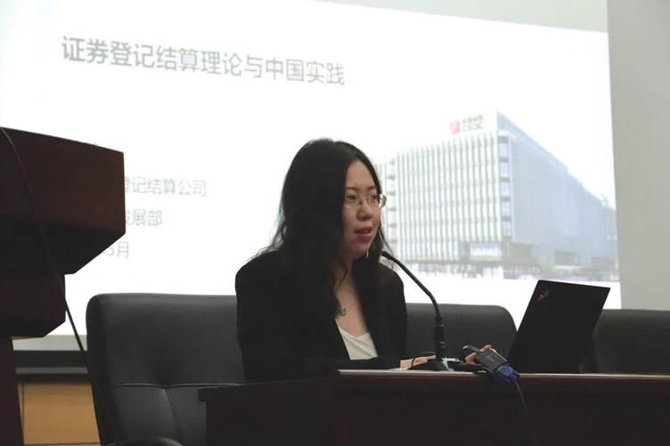 随后,中国结算总部李怡璇老师开展了以“证券登记结算业务理论与境内外实践”为主题的精彩讲解。李老师从我国资本市场登记结算体系概况、证券登记存管业务、证券结算及风险管理业务和证券账户管理业务等四个方面梳理了证券登记结算相关知识,向同学们科普了证券登记结算业务概念、历史沿革、业务特点及常见风险管理等内容。