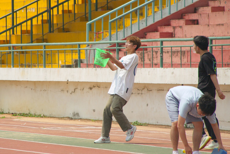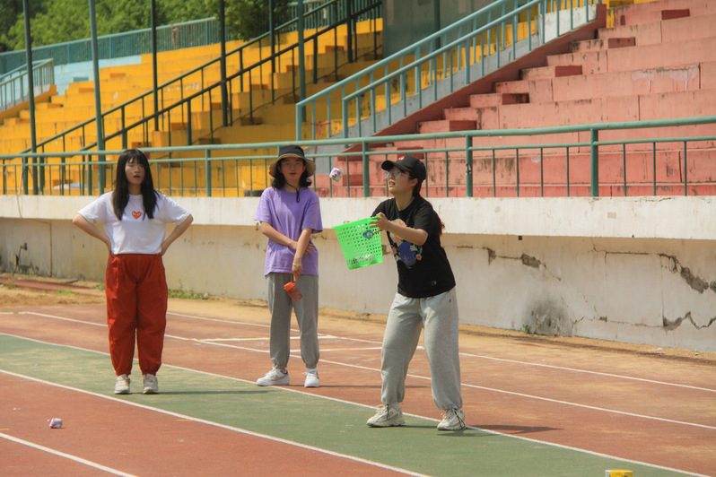 沙包掷准,男生组用速度与力量制胜,女生则以柔克刚用抛物线高弧度来取得更高的精度。
