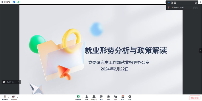 为增强韩国三级片 2024届毕业生就业意识,了解当前就业形势,增加职场竞争力,韩国三级片 于2月22日晚8点举办线上就业指导讲座。此次讲座特别邀请到党委研究生工作部就业指导办公室李袁老师主讲,讲座由商韩国三级片 沈炜策老师主持,全体2024届毕业研究生参加。